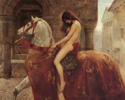 It is known that Leofric began spending large amounts of taxpayers' money, as politicians are wont to do, on grandiose public works, while the people of Coventry, as people are wont to do, lived in poverty. The legend says that Godiva, generous and strong-willed, was outraged at a poll or tax that Leofric was planning to levy on the people of Coventry, and she persistently asked him to lift the imposition, or at least use the money for the provision of works of art that the peasants might enjoy. Leofric laughed so much that he injured his left wrist slightly as he fell off his stool in the hall of the village burghers. However, the nouveau-riche gentleman offered her a deal: if his wife would ride naked on horseback through the town, then he would agree to waive the tax ...