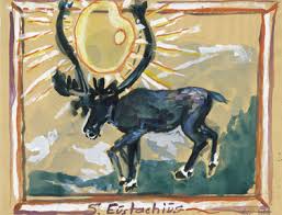 (Common meadow saffron, Colchicum autumnale, is today’s plant, dedicated to this saint)Hubert of Liège (feast day November 3), is a Christian saint who came upon a stag (sometimes described as a white stag) with a crucifix between its antlers. The stag threatened him with eternal damnation if he did not mend his ways, and so moved was Hubert by his experience, that he entered the monkhood, and eventually became Bishop of Liège, and the apostle of Ardennes and Brabant. Hubert is one of a number of Christian saints associated with deers and other horned animals, of whom we provide an overview in the Christian saints and the Horned God page in the Scriptorium.